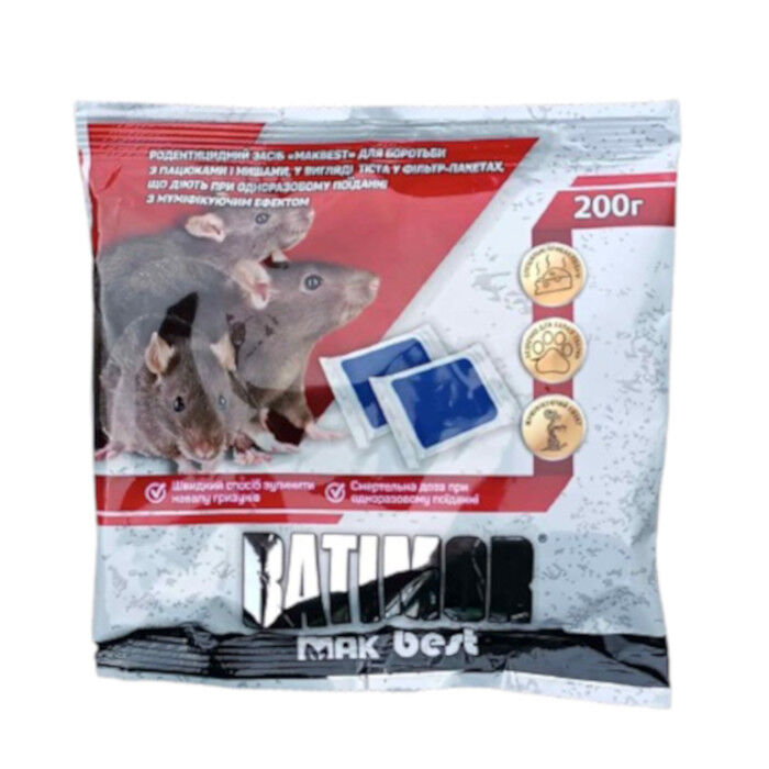 Ефективна отрута від мишей та щурів Ратімор у вигляді тіста, в складі речовина "Bitrex," яка запобігає випадковому ковтанню приманки домашніми тваринами та дітьми. Муміфікуючий ефект.